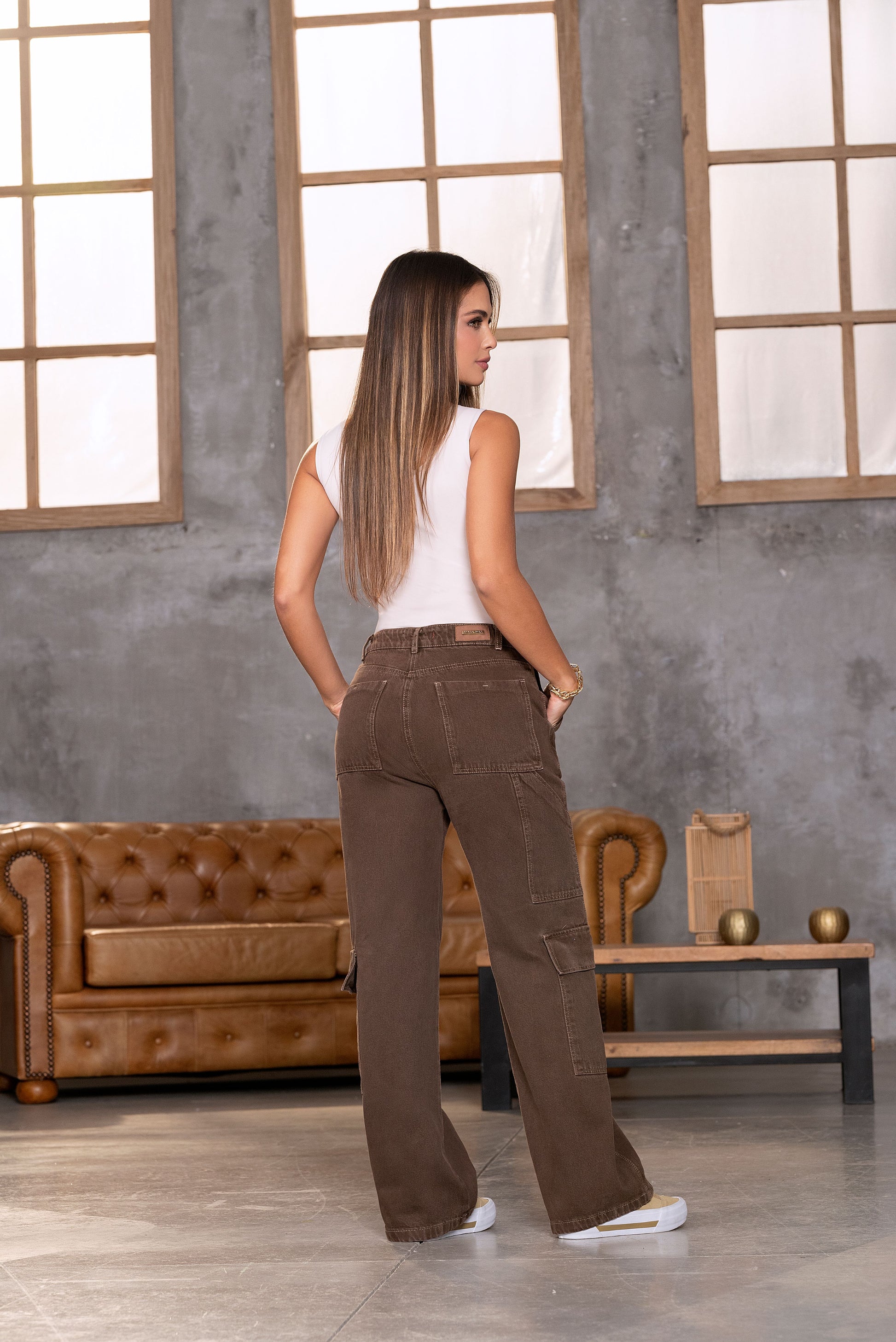 Jean Cargo Wide Leg Indigo Rigido Café Ref 1898